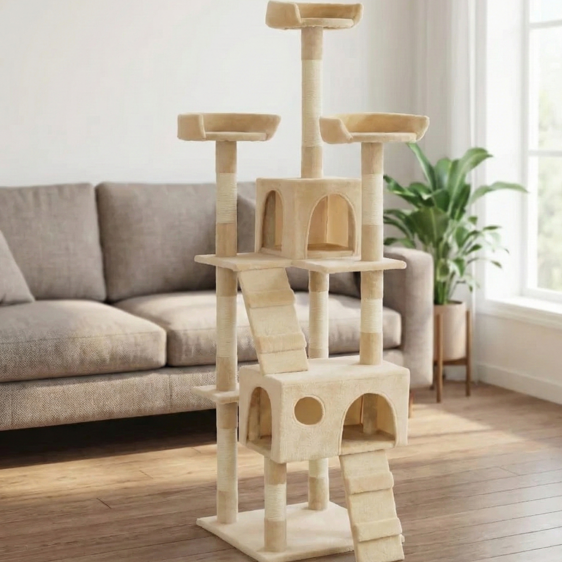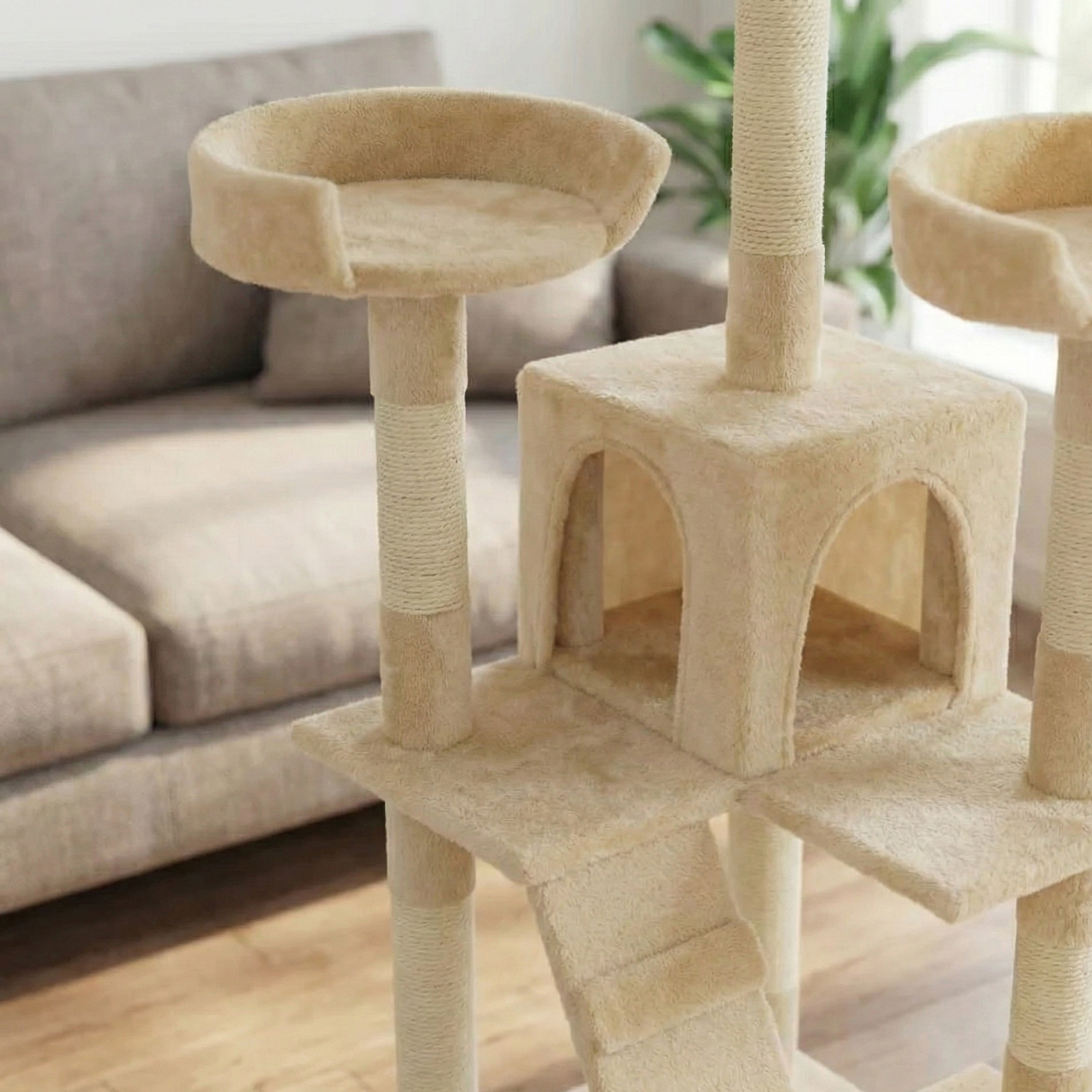 Geef je katten een beetje luxe met onze veelzijdige krabpaal! Deze heeft meerdere verdiepingen met een stevig frame dat bedekt is in zacht, comfortabel pluche. Het is de perfecte plaats voor je katten om te krabben, klimmen, zitten, verstoppen en te ontspannen.