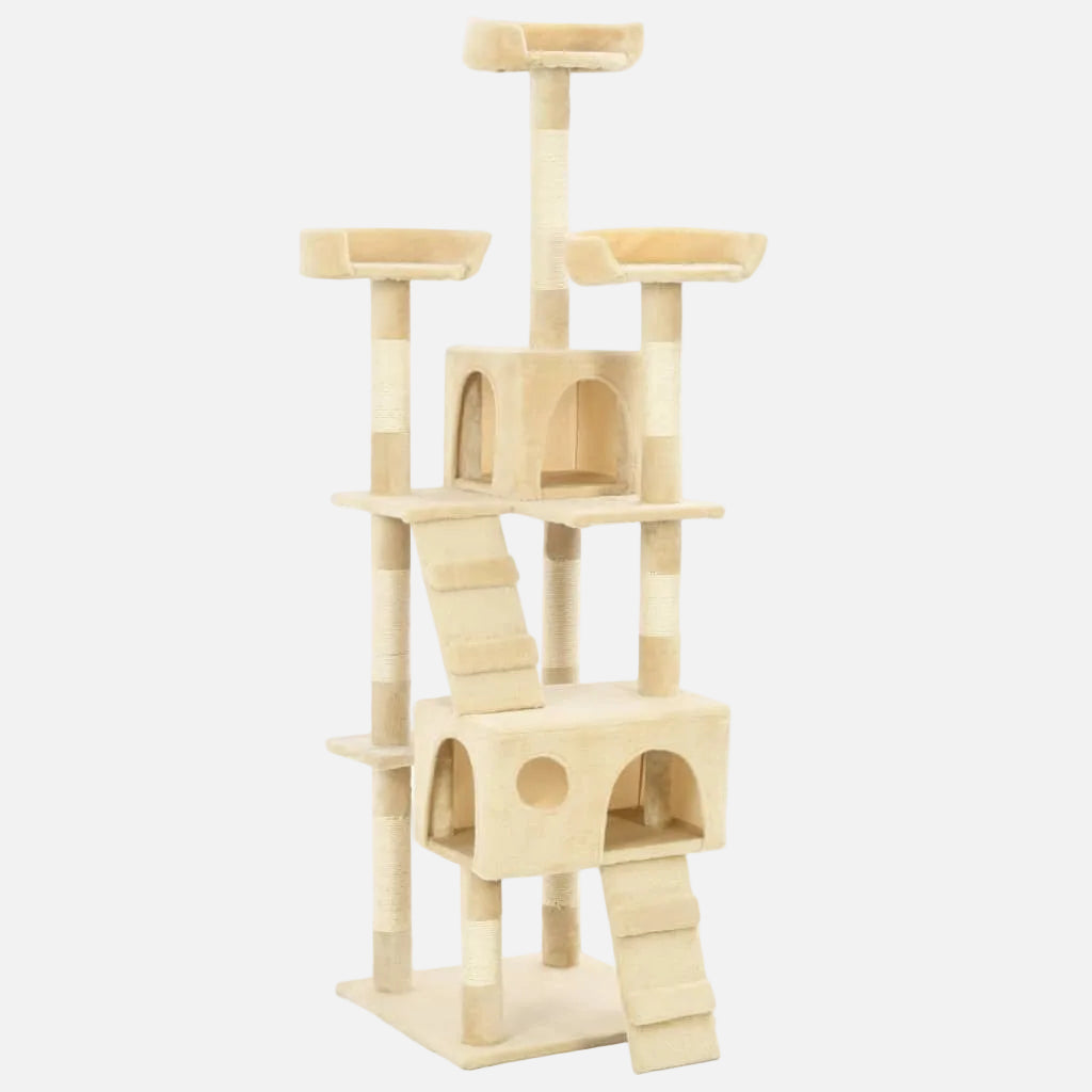 Je kattenvriendjes kunnen hun klauwen scherper maken met de krabpalen die omwikkeld zijn in sisaltouw, dit zorgt voor een gezonde uitlaatklep voor de krablust van je kat. Ze zullen het ook heerlijk vinden om achter elkaar aan te rennen terwijl ze van en op dit leuke speelcentrum springen. Wanneer ze genoeg gespeeld hebben kunnen je kleine vriendjes uitrusten op de bovenste platformen, waar ze een beter uitzicht hebben. Ze kunnen zich ook verschuilen in de knusse huisjes om een dutje te doen. Met al deze leuke functies wordt dit kattenspeelhuis de favoriete hangplek van je harige vriendjes! De kattenkrabpaal is eenvoudig te monteren.