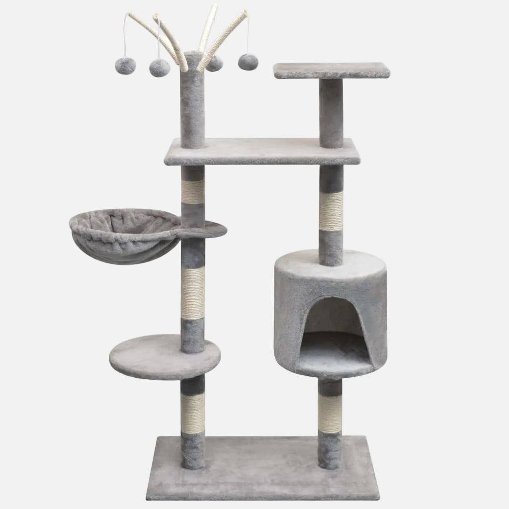 Uw kattenvriendjes kunnen hun klauwen scherper maken met de krabpalen die met sisaltouw omwikkeld zijn. Dit zorgt voor een gezonde uitlaatklep voor de krablust van uw kat. Ze zullen het ook heerlijk vinden om achter elkaar aan te rennen terwijl ze van en op dit leuke speelmeubel springen. Aan de bovenkant van het speeltje hangen speeltjes die uw nieuwsgierige katten zullen vermaken. Wanneer ze genoeg gespeeld hebben kunnen uw kleine vriendjes uitrusten op de bovenste platformen, waar ze een beter uitzicht hebben. Ze kunnen zich ook verschuilen in het knusse huisje om een dutje te doen of lekker ontspannen in de comfortabele hangmat.