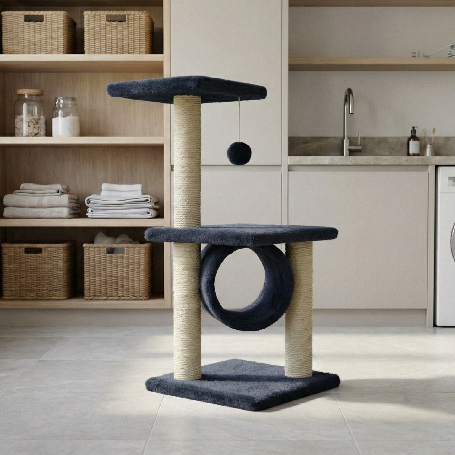 Het met pluche bedekte oppervlak is zeer comfortabel en de krabpaal is omwikkeld met sisaltouw. Het heeft een hangende bal als speelgoed en uitzichtplatformen en rustgebieden om je kleine vriend te vermaken. Het onderstuk is stevig en stabiel. Dit product is geschikt voor kittens.